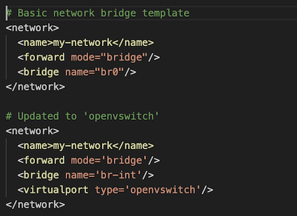 Below is a comparison from my lab showing a basic Linux Native Bridge network defined in Libvirt and an updated version switched to OVS. Note that the <bridge> element has been updated to br-int (the OVS bridge created by ovn-controller), and the new <virtualport> element identifies this as an OVS bridge network.