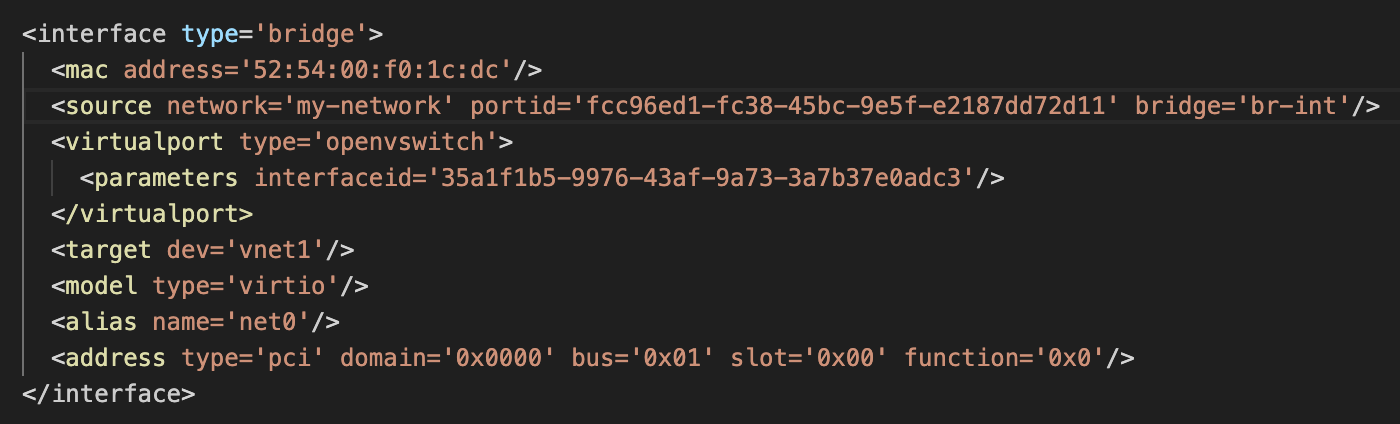 As a quick side note, the <target> element is what appears in OVS registered on br-int. So, consider how to set that to ensure the naming is simple to understand, as the default naming scheme isn’t very intuitive.